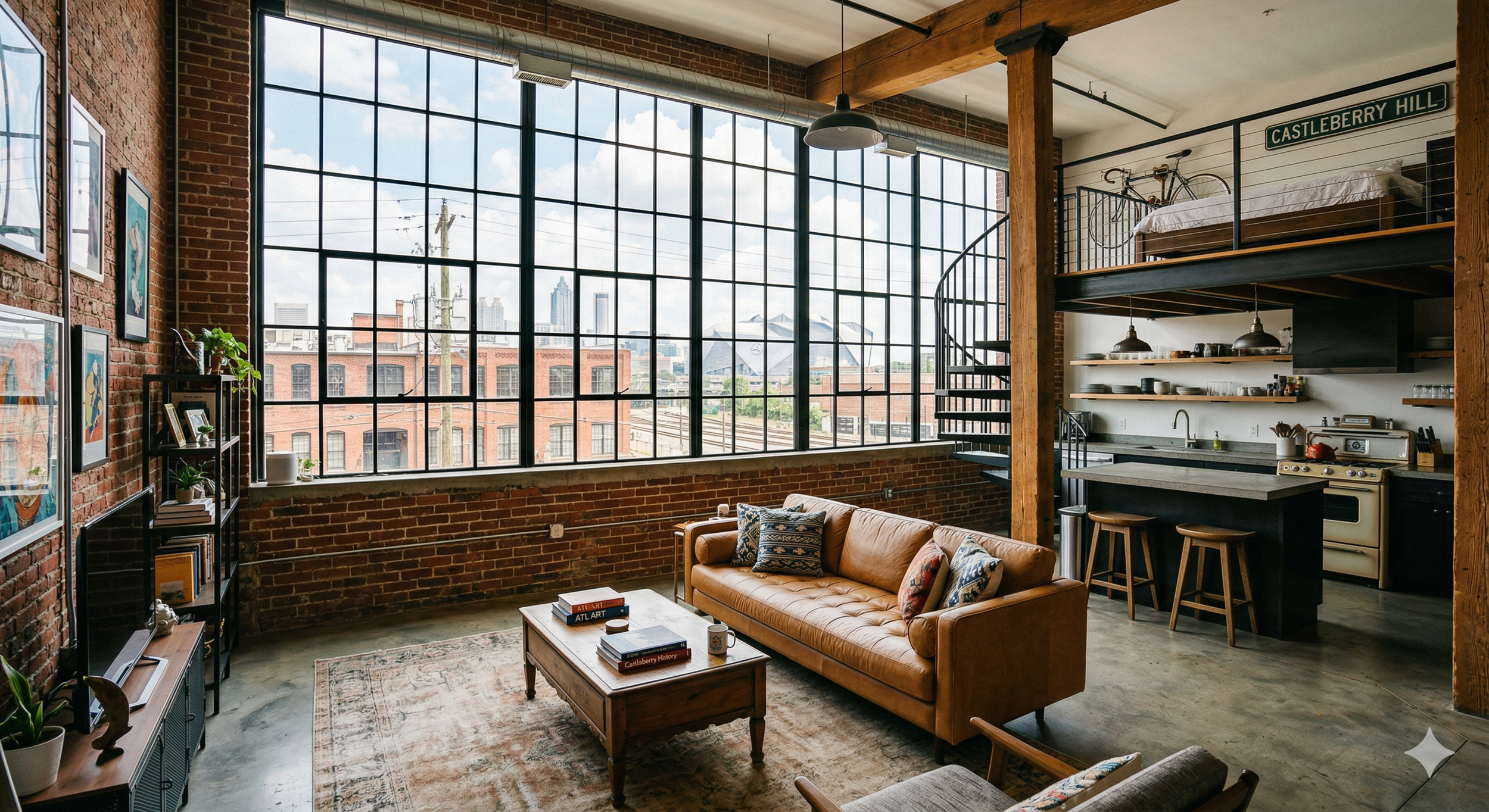 Castleberry Hill sits at Atlanta's front door. From Peters Street, you can see Mercedes-Benz Stadium. From the Nelson Street Bridge, you look directly into the Centennial Yards construction zone, the largest urban redevelopment project in Atlanta's history. The lofts here occupy buildings that were warehouses and factories in the 1800s — exposed brick, heart pine floors, 20-foot ceilings, palladium windows. This neighborhood has a specific, undeniable physical character, and that character is one of the main reasons buyers search for it.