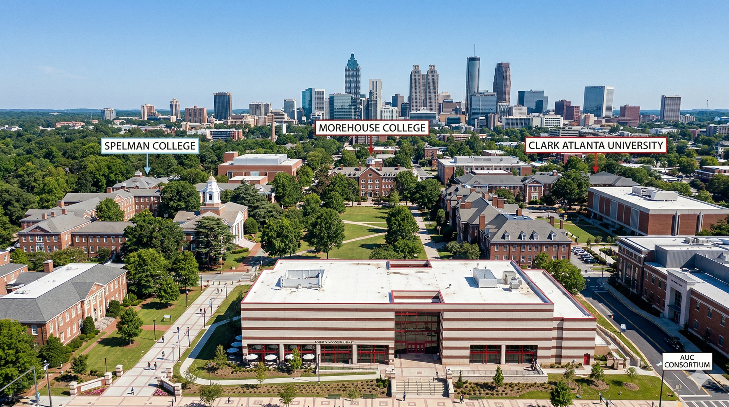 The AUC Campus Area. The cluster of Clark Atlanta University, Morehouse College, Spelman College, Morris Brown College, and the Interdenominational Theological Center sits directly south of Vine City along MLK Jr. Drive. The campus area includes dining options, events open to the public, and is home to some of Atlanta's most significant cultural institutions.